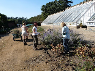 Despite the 26-27 degrees of heat the volunteer force were busy defining the edges and borders in front of the tall vineries whilst the Writtle College student was laying the edge stones. Now the public will be able to walk through the doorway to the vineries and see the defined areas set aside in the past for cut flowers and soft fruit.